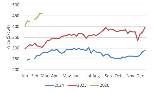 Moving to 2025, the price of 500-600 pound steers started high ($300/cwt) and continued to increase throughout the entire year. It would appear there was a plateauing of prices in the last quarter of the year, but prices increased nearly $100 per hundredweight over that year which is a $550 per head increase in value. The 2025 price movement appears to have extended into 2026 as prices started near $400 per hundredweight and had increased $62 per hundredweight by the end of February. The first week of 2024, a 550 pound steer in Tennessee averaged $1,350 per head. The same animal the first week of 2025 was valued at $1,640 per head and then $2,240 per head the first week of 2026. By the end of February 2026, the same animals were valued at $2,540 per head.